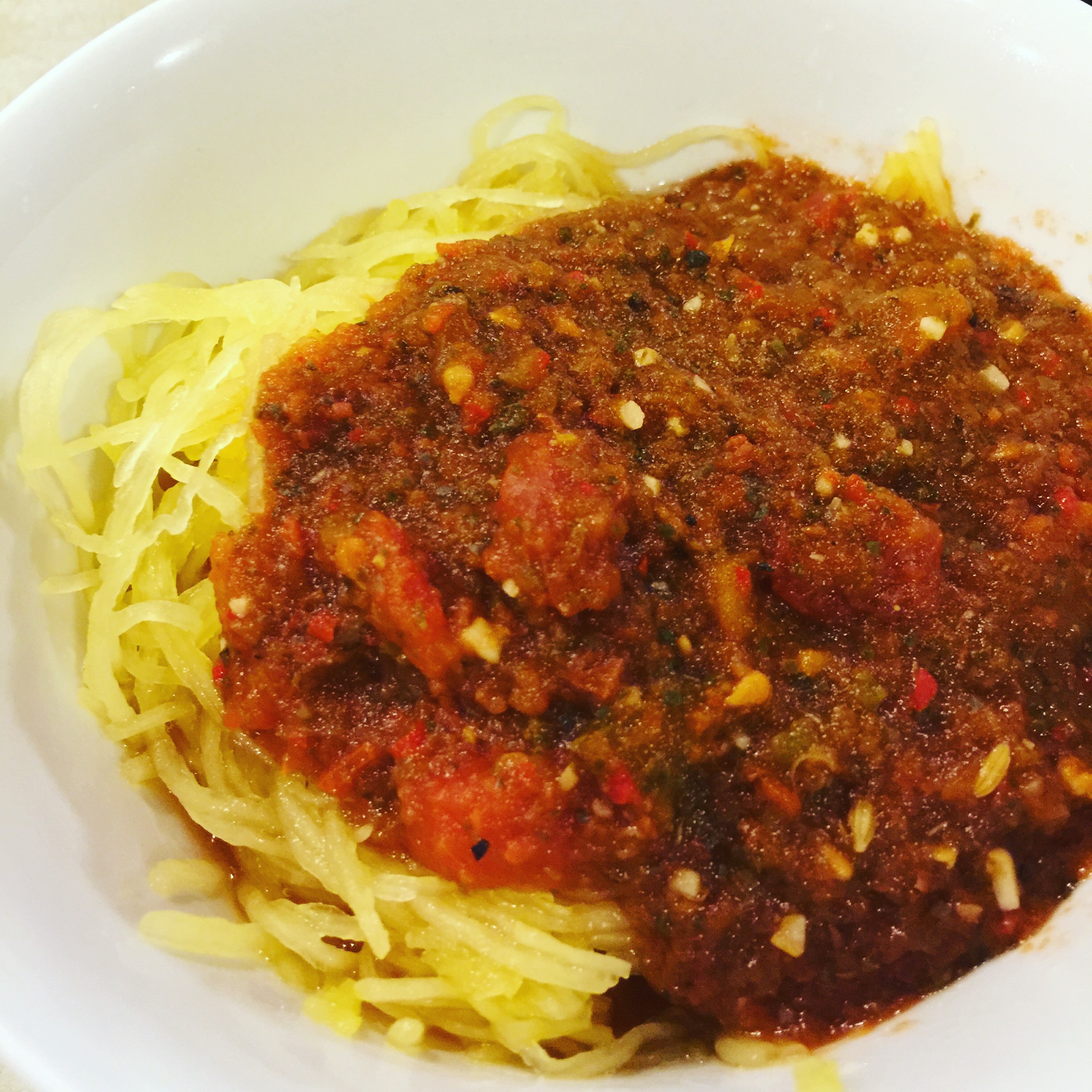 By the end of the day I was sooooo ready for some non-sweet veggies! I made some legal vinegar and lemon zest salad dressing with garlic and other favorite spices…it was ok. The best part about day 2 is the baked potato for breakfast and the spaghetti squash with homemade sauce for dinner. It was all veggies and spices and will replace any form of sauce we have made in the past!!! So tasty and the freshness really made the difference. I puréed about 6 tomatoes, peppers, onion, fresh spinach and a jalapeño. I added fennel, basil, oregano, cayenne (because it goes in everything), pepper and probably others I’ve forgotten. I cooked it at a med-high heat so everything cooked together and the flavors blended nicely. The spaghetti squash was just cut in half, removed seeds, laid cut side down on metal pan with a lip and added about a half cup of water to the bottom. I baked on 350 for 45 minutes, forked out the spaghetti and YUM! Warm yummy goodness! Brad said, “Spaghetti Squash is so cool” and requested a Phad Thai experiment for next week.